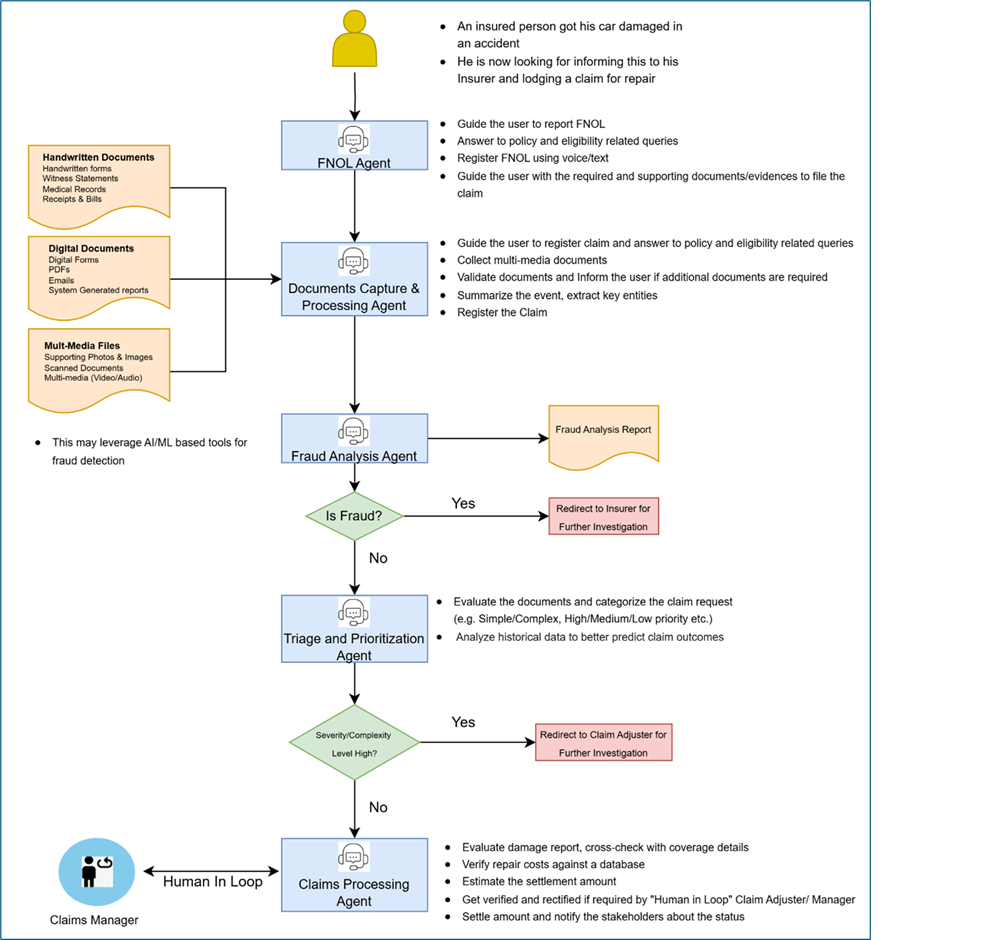 As seen in the above diagram, the FNOL agent collects incident details and initiates digital claims, validating input automatically. The document capture and processing agent captures, extracts, validates, and stores data from various formats, learns document types, and flags missing items. The fraud analysis agent applies rule-based and ML models to detect anomalies, updating logic continuously and routing claims accordingly. The triage agent assesses complexity and urgency, adjusts criteria based on trends, and escalates high-impact cases. The claims processing agent confirms coverage, calculates settlements, prepares offers, and optimizes decisions for fairness and speed, validating with adjusters before notifying stakeholders. Each agent exhibits autonomous, adaptive behaviour throughout the process.