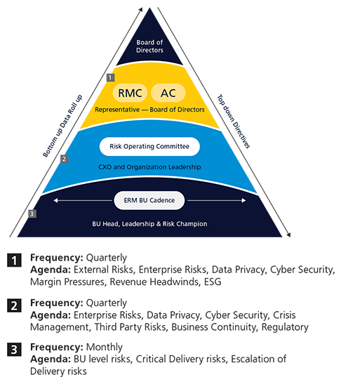 ERM Framework implements management of risks at various layers of the organization including risks at project level, account level, Business unit level and Enterprise level. Detailed risk management process helps to identify and treat the risks before it surfaces as an issue. The process is enabled through a digital platform that provides an enterprise-wide view of risks, enabling informed decision-making.