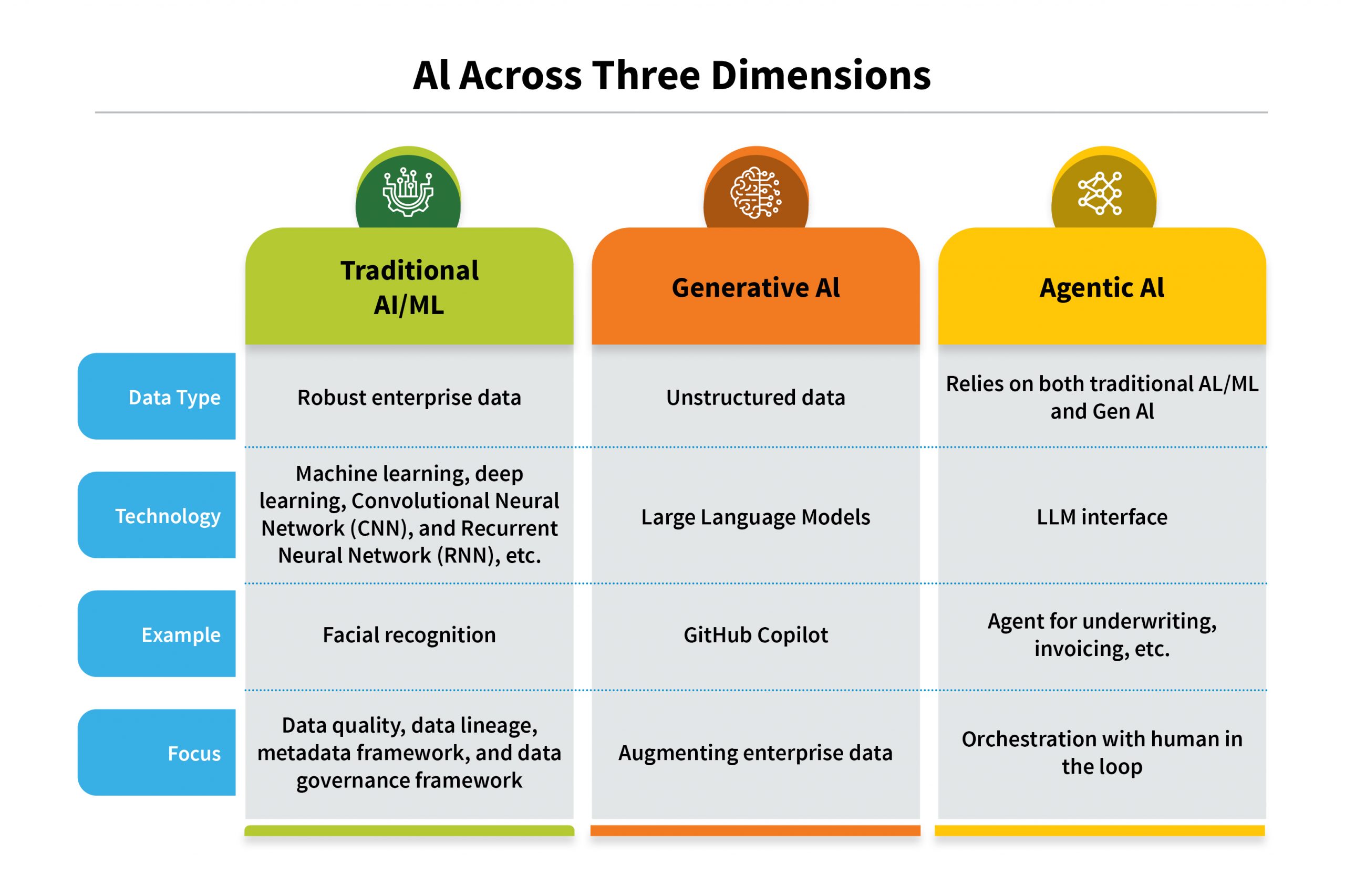 Across all three dimensions of AI, trust in the data lifecycle is the common thread that determines success. Whether it’s ensuring the accuracy of training data for traditional AI, preventing hallucinations in generative AI, or enabling ethical decision-making in agentic AI, trust must be engineered into every stage of the lifecycle. Without it, the potential of AI to transform enterprises is compromised, leading to unreliable outcomes and eroded confidence. Here’s a quick overview of data across all three dimensions: Traditional AL/ML, Generative AI, and Agentic AI.