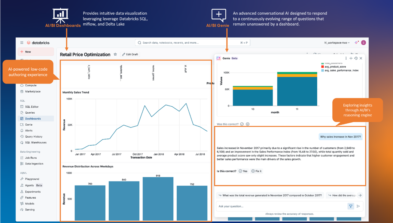 Figure 2: Retail price optimization dashboard built in Databricks; Genie as Conversational AI