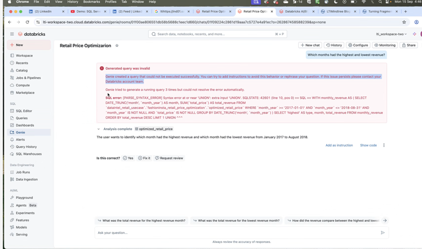 The following example shows Genie producing an invalid query and prompting the user to correct it, rather than giving a random answer.