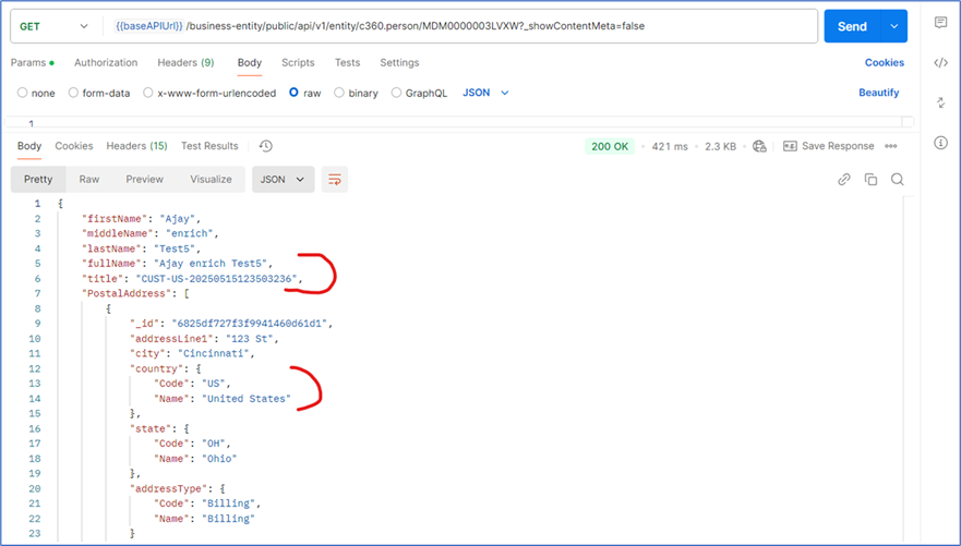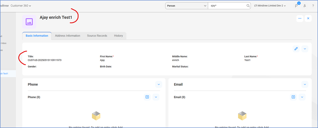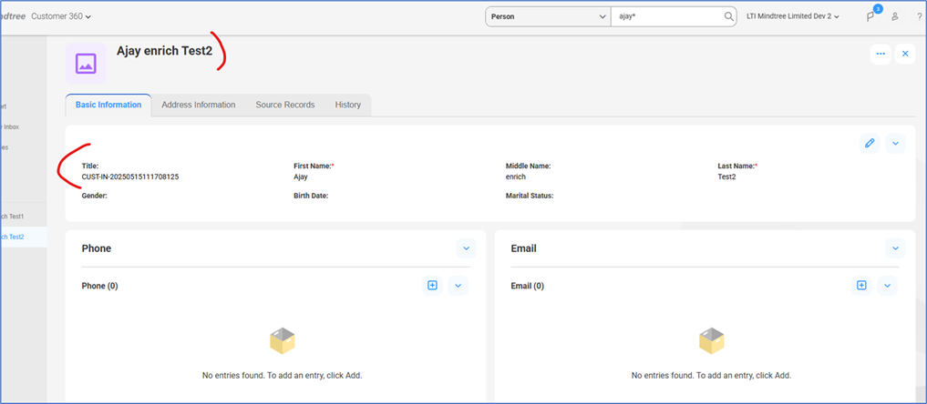 Then, a person record for Ajay is created with a USA address, using the C360 service. Note that the title is not populated.