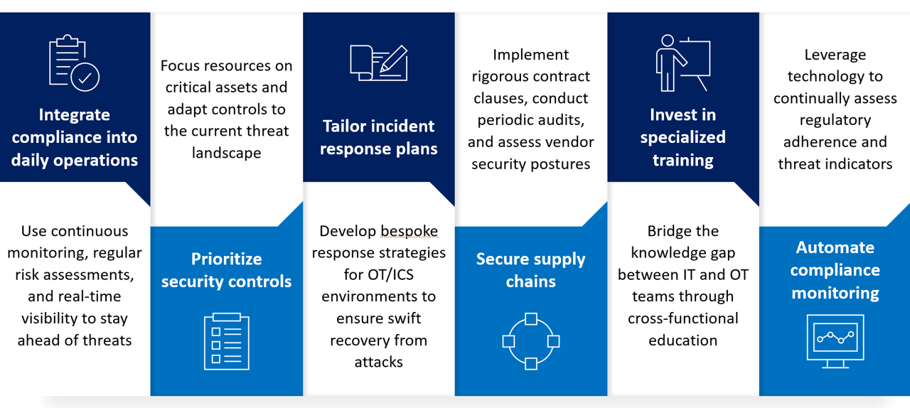 To build true resilience in critical infrastructure, organizations must integrate compliance into daily operations through ongoing monitoring and risk assessments. Prioritizing controls based on asset importance and current threats, enhancing incident response tailored to OT/ICS environments, securing the supply chain with robust vendor agreements, and investing in specialized cross-functional training are all essential steps. These practices go beyond mere checkbox compliance, embedding cybersecurity as an active, continuous process.