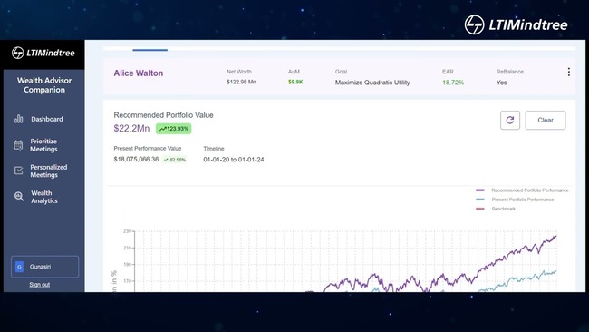 LTIMindtree’s BlueVerseTM Wealth Companion is a robust, AI-powered, and quantum-integrated platform designed to transform the wealth management industry. It empowers wealth managers and financial advisors to deliver smarter, faster, and more personalized services such as real-time portfolio analysis, investment report generation, and proactive rebalancing strategies. By harnessing generative AI, quantum annealing, and advanced wealth management analytics, BlueVerse Wealth Companion enables advisors to make data-driven decisions with precision, significantly boosting their productivity and enhancing client meeting preparation and prioritization.