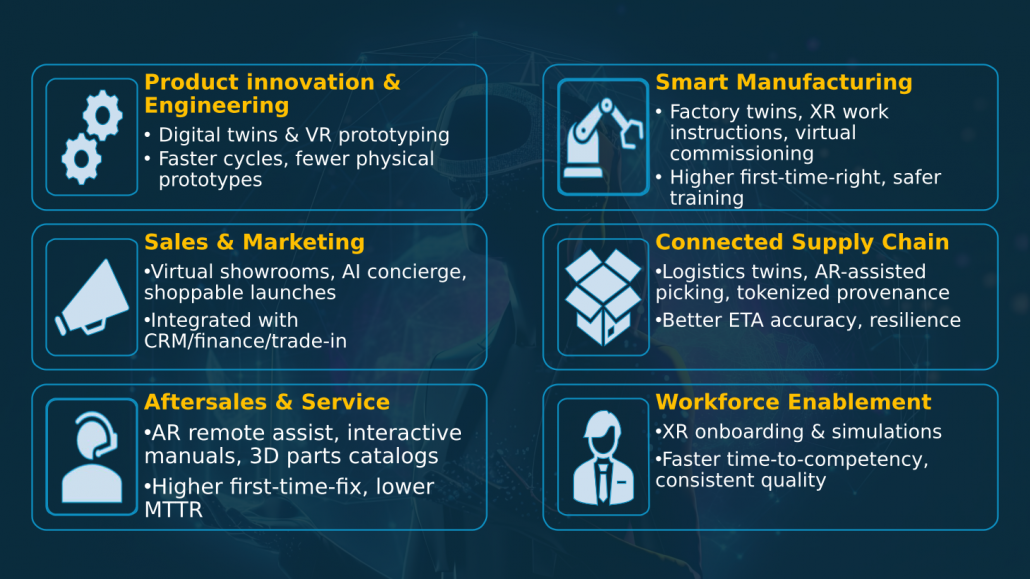 With AI accelerating across industries, the metaverse in the automotive industry is emerging as a key lever for future-ready automotive businesses. According to Persistence Market Research, the automotive market is valued at USD 4.38 billion in 2025 and projected to reach USD 30.6 billion by 2032, at a CAGR of 32%.2 Although still in its early stages, adoption is growing as automakers explore new opportunities in design, sales, customer experience, and operations. From a sales and marketing perspective, the metaverse can revolutionize customer engagement through personalized experiences, global reach, community building, and data-driven insights.